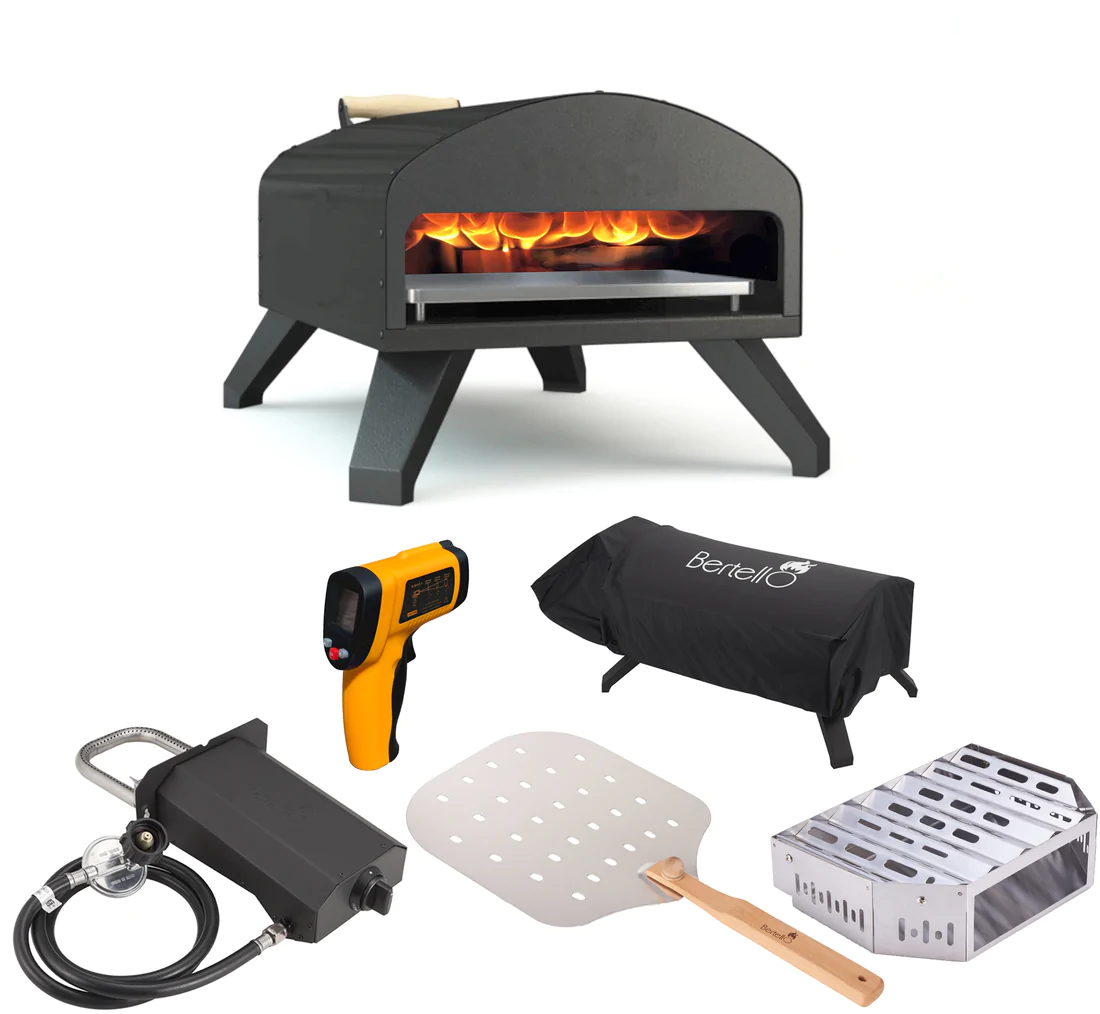 -Includes: Bertello Pizza Oven, Gas Burner, Wood Burning Tray for Gas Burner, Pizza Peel, Wood/Charcoal/Pellet Tray, Pizza Stone, Infrared Thermometer, Weatherproof Cover