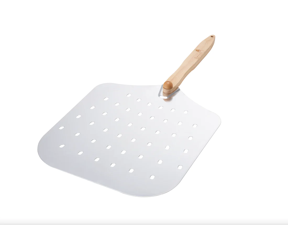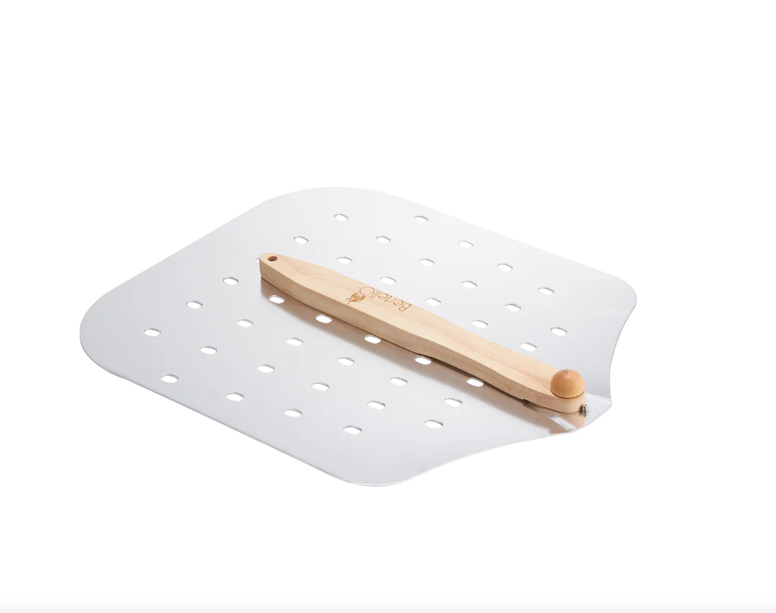 16″x16″ Pizza Peel with perforated blade to allow excess flour to fall through the holes, and not stick to the bottom of your pizza. This tool is perfect for sliding pizzas in and out of the Bertello Grande 16″ Outdoor Pizza Oven!