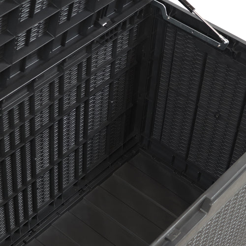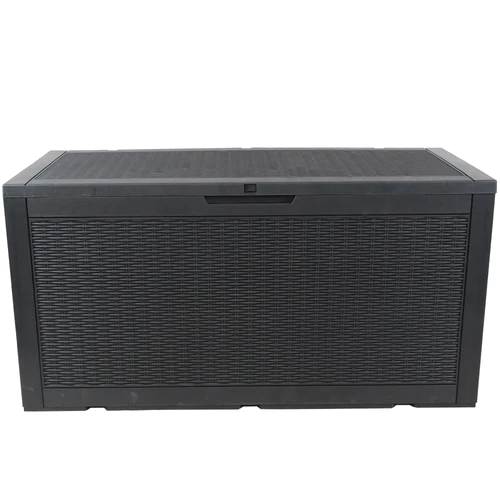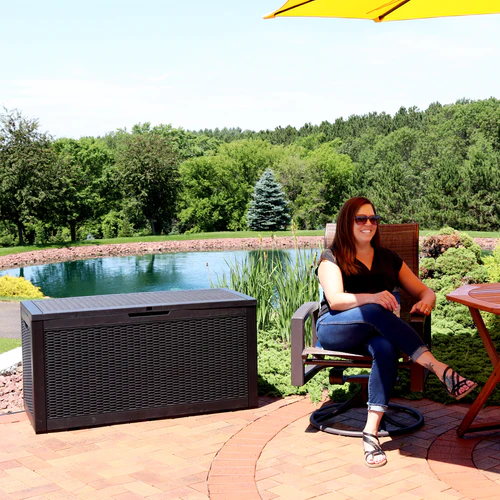 Easily store all extra items on the deck, patio, or porch with this large outdoor deck storage box! The rattan style deck box features a UV-protected polypropylene and resin construction designed to last through many seasons. Side handles make it easier to move the box when needed. Additionally, the lid is lockable so you can protect the items within it with confidence. Please note, a padlock is not included with the storage box.