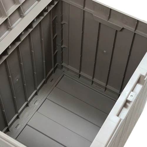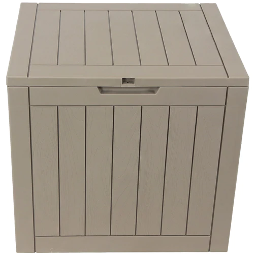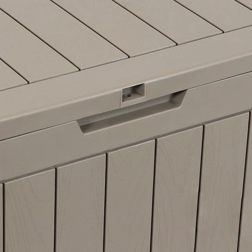 Stow outdoor goodies in style with this outdoor deck storage box. The faux wood box features a lockable lid (padlock not included) and side handles to easily move the box as needed. The weather-resistant, polypropylene and resin construction with UV protection helps ensure long-lasting strength and beauty. Use the box to stylishly store cushions, pillows, decor, tools, and more.