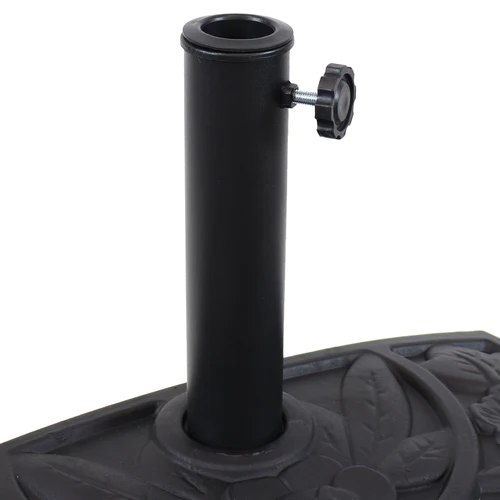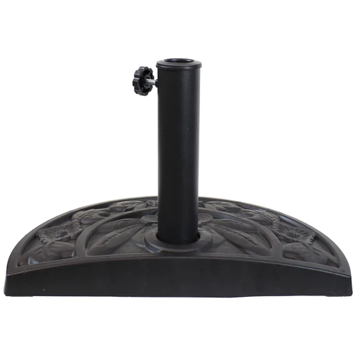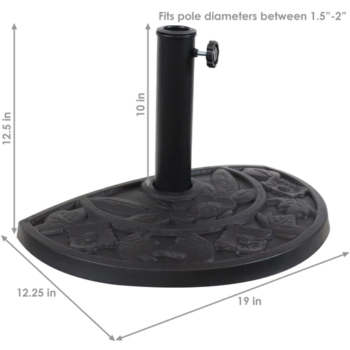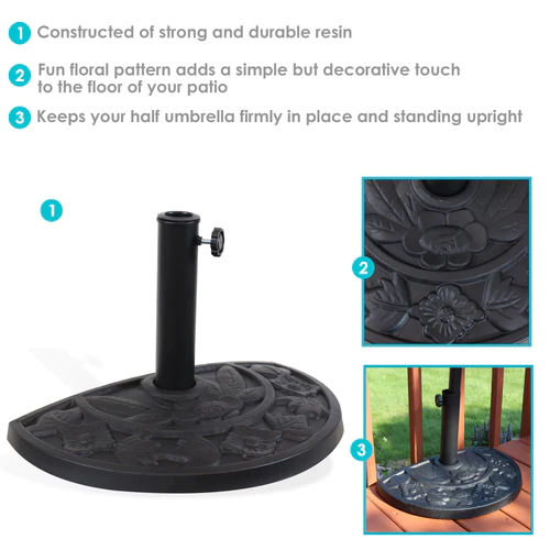 Keep your half umbrella safely in place while adding a beautiful floral accent to your patio with this half umbrella base. Constructed of easy-to-maintain resin, this patio half umbrella stand will withstand the elements and store easily. The adjustable thumb screw allows this base to fit half umbrellas with poles 1.5″ to 2″ in diameter. This half base is designed to be used against an exterior wall with a half umbrella (not included) and patio table (not included) to provide shade for smaller spaces, including patios, balconies, and decks.