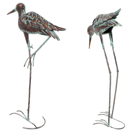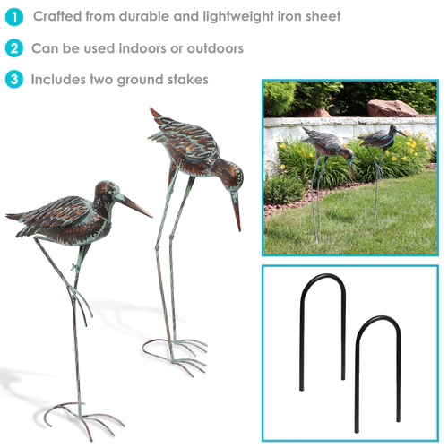 Add a rustic yet elegant style to your garden, yard, or patio with these two lively crane statues. Both cranes are made with durable and rust-resistant iron and are finished with a brown coating and blue paint accented in each layered feather. These outdoor statues are designed to stand on their own with rounded feet. The crane bending towards the ground perfectly complements the crane standing tall on one leg and accentuates your own outdoor setting, adding a lively, natural look to your space.