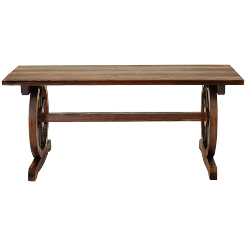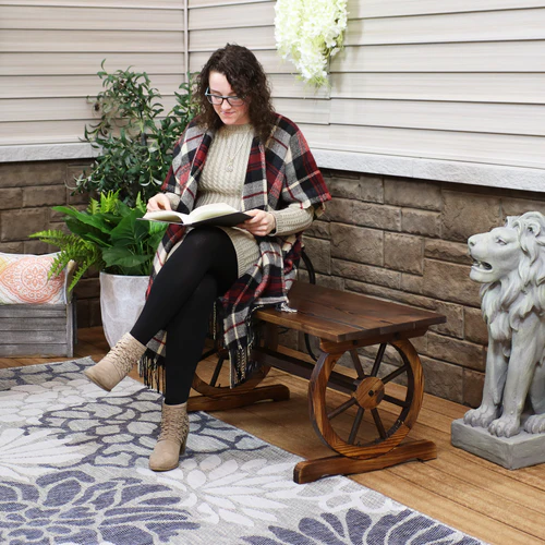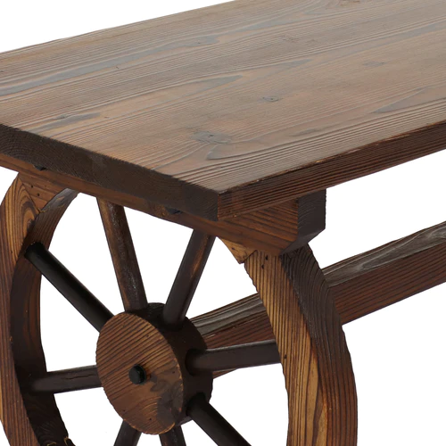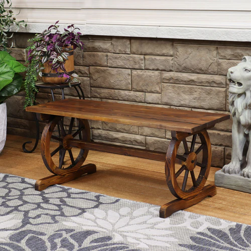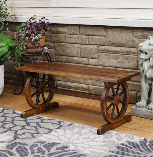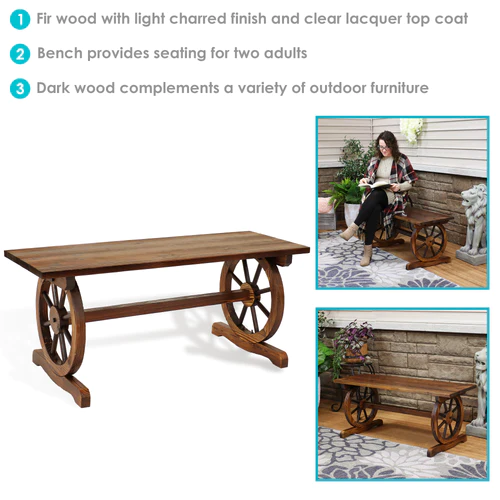 Create a comfortable place to relax on your front porch or in the garden with this unique wagon wheel bench. Featuring two 14.75″ diameter wagon wheels as a base, this stylish outdoor bench was made from sturdy fir wood with a unique charred finish and clear lacquer for lasting durability.