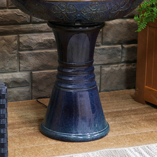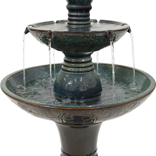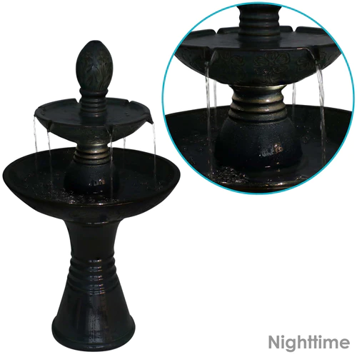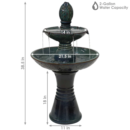 Add the elegance and grace to your patio or garden space with this 2 tier outdoor water fountain. Constructed of smooth and durable ceramic, this outdoor fountain will be sure to be a soothing addition to any outdoor living space. Water gently flows down into the basin from the tier above to create a mesmerizing effect.