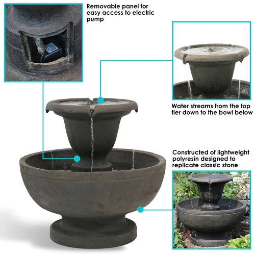 Add old-world charm and appeal to your space with this tiered outdoor water fountain. Unwind to the soothing sounds as water gently bubbles on top and flows down into the bottom basin. Made of polyresin material, this tiered outdoor water fountain will provide you many years of beauty and performance. Plus, no complicated plumbing is required. Simply fill with water, plug in, and enjoy.
