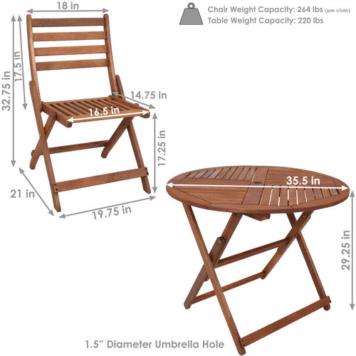 The stylish Sunnydaze 5-Piece Meranti Wood Round Dining Table with Folding Chairs is perfect for outdoor entertaining. Made from durable yet elegant meranti wood, this outdoor patio set features a classic design that will complement any outdoor space. Plus, the set easily folds for convenient portability and storage.