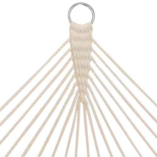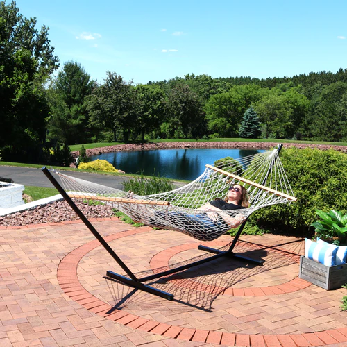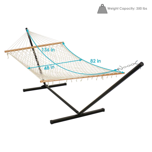Enjoy relaxation with this American classic. The cotton rope hammock comes with natural unfinished wood spreader bars that help with even distribution of weight. The included stand allows it to be easily set up in the yard. Please note that the hammock should be brought indoors when not in use due to the nature of the unfinished spreader bars.