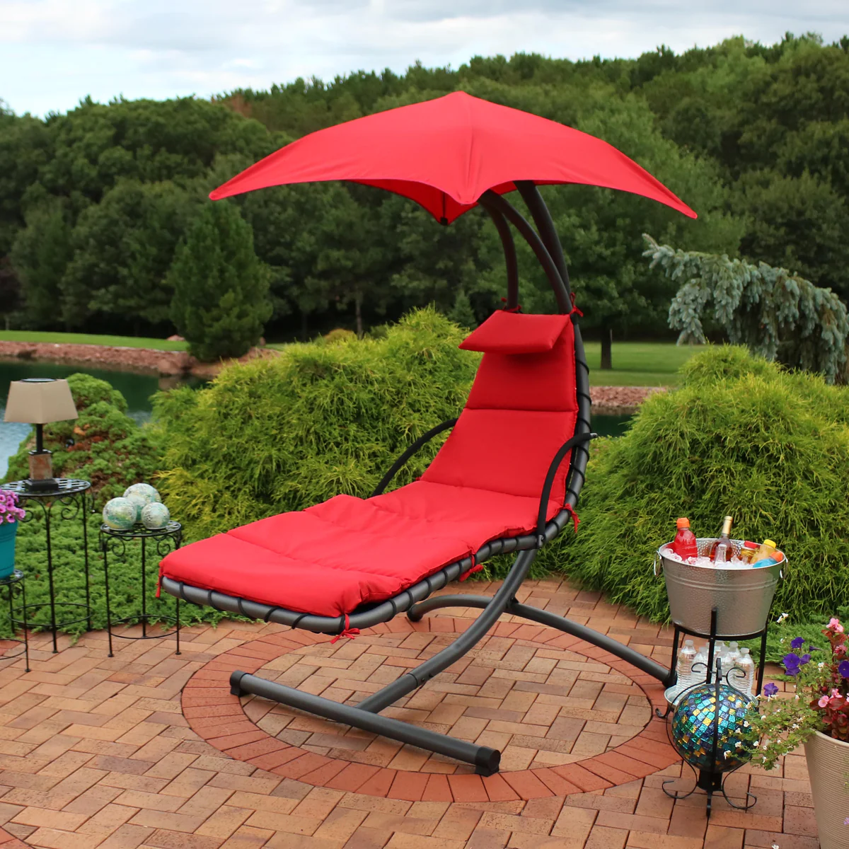 Unwind and relax in ultimate comfort with this floating chaise lounge chair. The C-shaped hanging stand will give you the calm feeling of floating on the air whenever you sit. The pad and pillow are made with a polyester cover and polypropylene fiber fill for added comfort and are secured to the stand with their fabric ties. Also, the umbrella, pad, and pillow can easily be removed for cleaning to improve longevity.