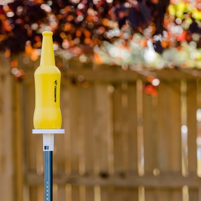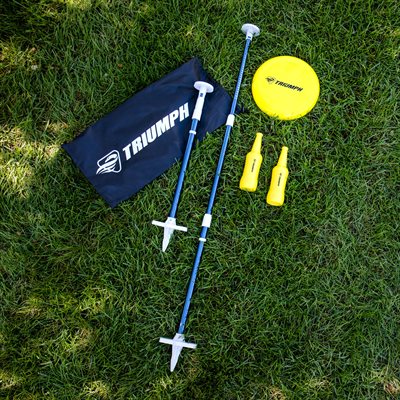 Let the games begin with the Triumph Bottle Battle! Competitors attempt to knock down their opponents’ bottle or pole while the defensive team tries to catch the disc and bottle before they hit the ground. This incredibly fun outdoor game set includes all accessories and is ready to play out of the box. Easily assemble the two 1” diameter aluminum telescoping and locking poles with the 5” diameter bottle platforms. The reinforced spike easily and firmly presses into any soft surface ground with your foot. Place the two 175-gram non-breakable life-like bottles on top of the platforms and use the 165-gram playable disc to target the bottles. Easily keep track of the score with the built-in slide scoring system. Set up and tear down takes less than one minute and can be played on 20-, 30-, and 40-foot-long areas depending on skill levels. After you’re finished playing, pack up the entire set in the heavy-duty blue carry bag with white logo for added convenience and no lost pieces.